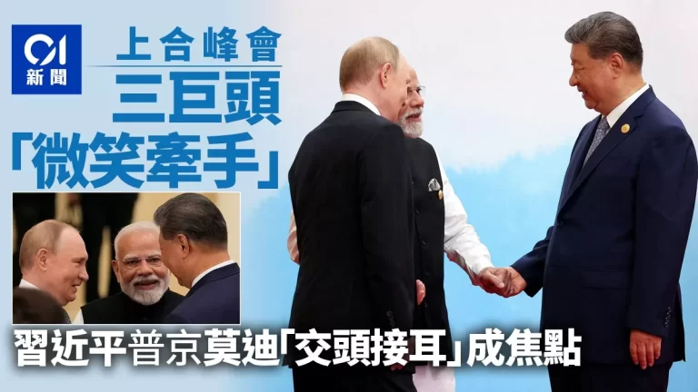 上海合作组织9月1 日上午在天津举行成员国元首理事会25次会议,中国为今年度轮值主席国,与会的重要国家元首包括俄罗斯总统普京(Vladimir Putin)与印度总理莫迪(Narendra Modi)。在元首理事会召开前,出席的各国领导人先在场外合影留念,当时可以见到普京与莫迪上前与中国国家主席习近平交谈,期间三人言谈甚欢、面带微笑;莫迪还同时牵着习近平和普京的手。合照结束后,三人再次凑在一起交谈,能感受到他们互动十分密切。