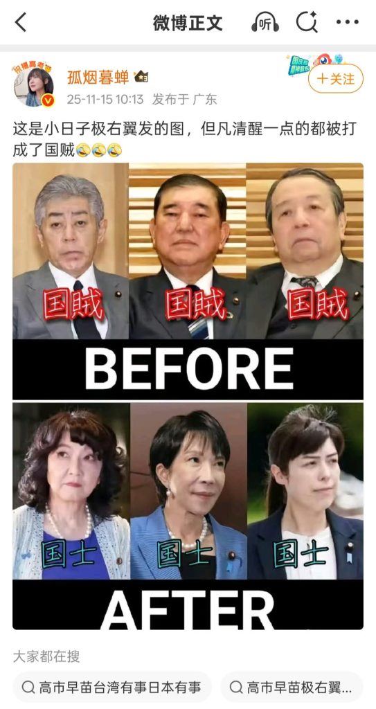 高市早苗在作死的路上越走越远,越走越狂,其代表的日本右翼成功将亚太各国家间矛盾,转换成了二战受害国集体对日矛盾。高市凭一己之力将中国、朝鲜、韩国拧成一股绳儿,吓得美国总统公开与日划清界限,俄罗斯亦发表声明谴责日错误行径。当下,朝韩没矛盾,中韩没矛盾,中美都可以没矛盾,中朝韩俄四国统一战线,一致对日本 !