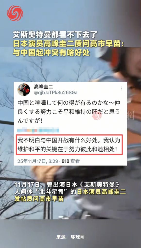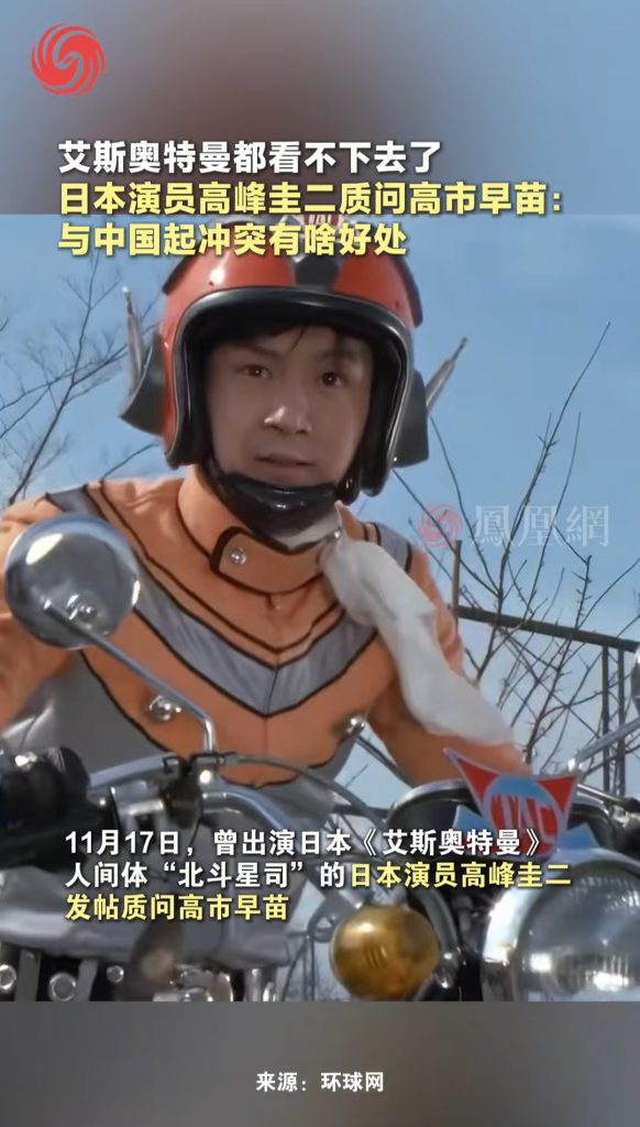 11 月 17 日,艾斯奥特曼人间体扮演者高峰圭二在其社交平台发文,质问日本首相高市早苗有关对华挑衅性言论。