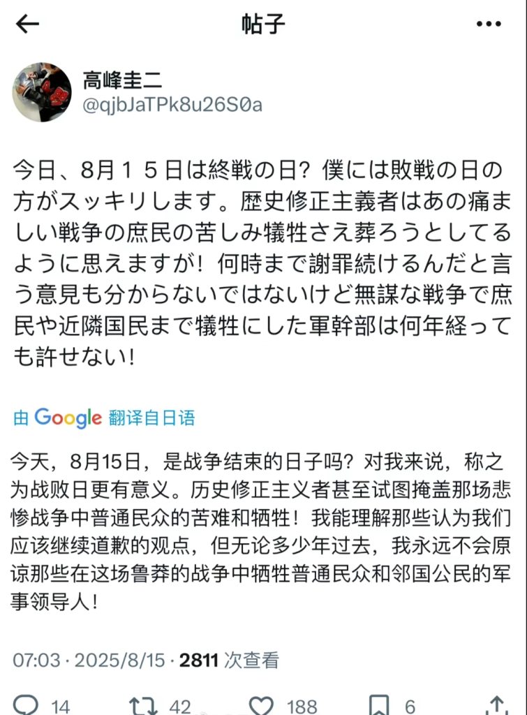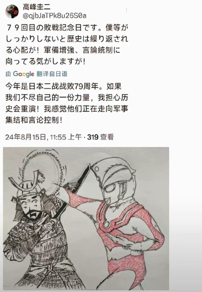 没想到圆谷当年请来了真艾斯 !高峰圭二一直致力于反战宣传,几乎每年 8 月 15 日,高峰圭二老爷子都会在其社交账号发文纠正日官方叫法,坚称 8 月 15 日为 “ 日本战败日 ” !此举收获广大奥迷好感与称赞。网友感叹圆谷请来了真正的艾斯 !