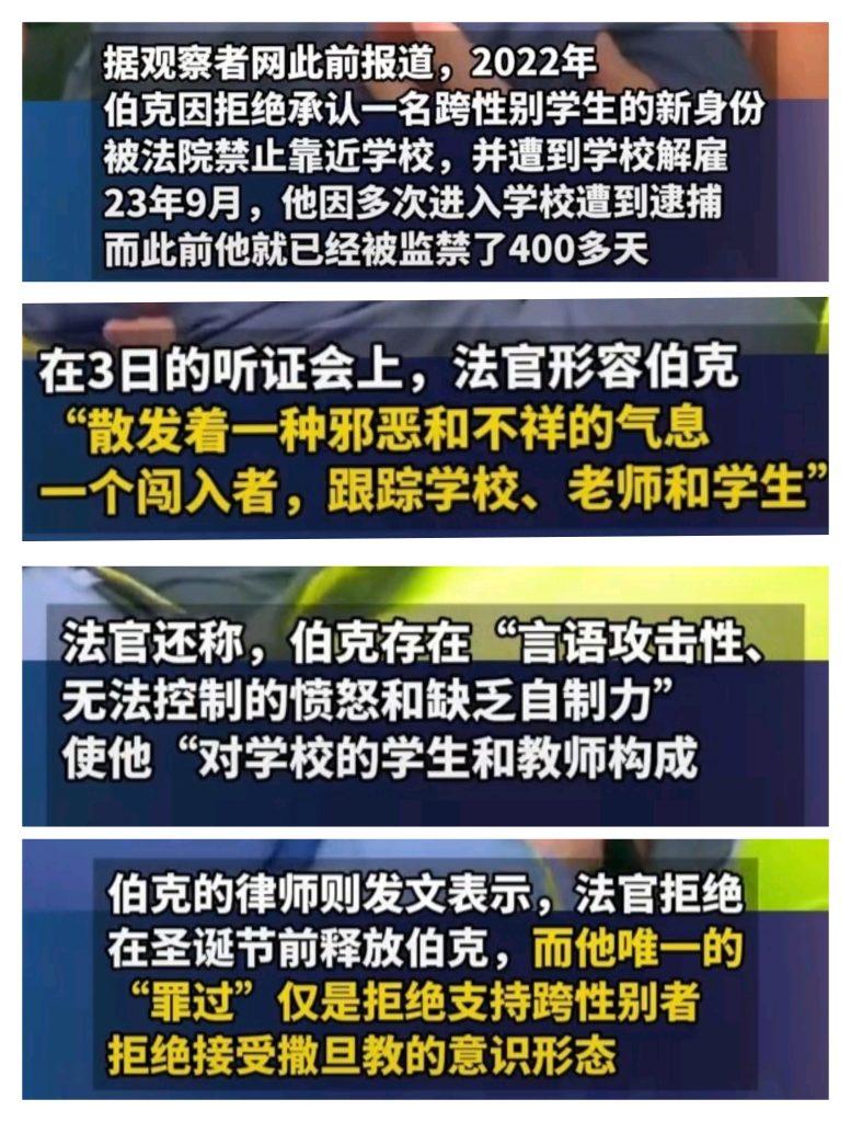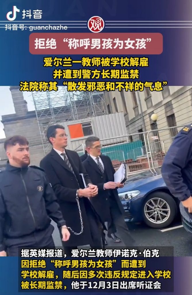 据英媒报道,爱尔兰教师伊诺克·伯克因拒绝“称呼男孩为女孩”而遭到学校解雇,随后因多次违反规定进入学校被长期监禁。听证会上,法官形容伯克 “ 散发着一种邪恶和不祥的气息 ”