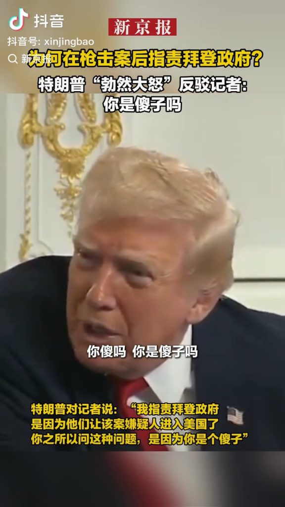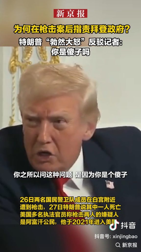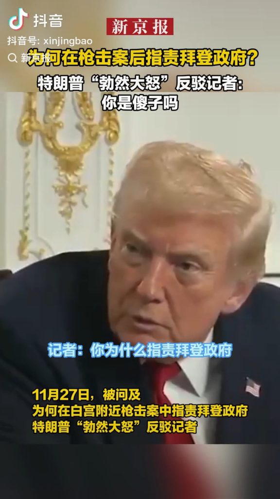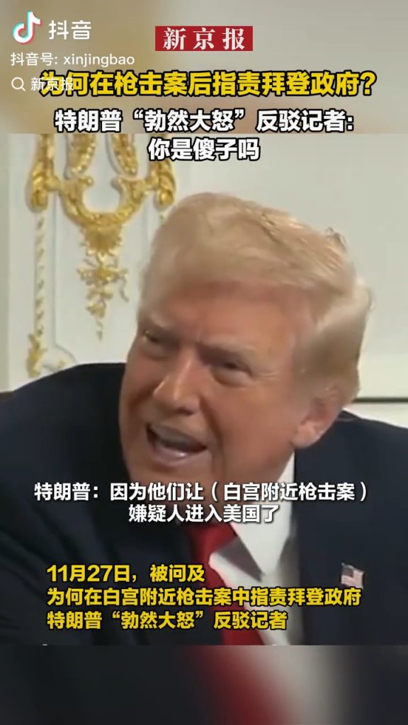 11月27日,被记者问及为何在白宫附近枪击案中指责拜登时,特朗普呛记者:“ 你是傻子吗 !”
