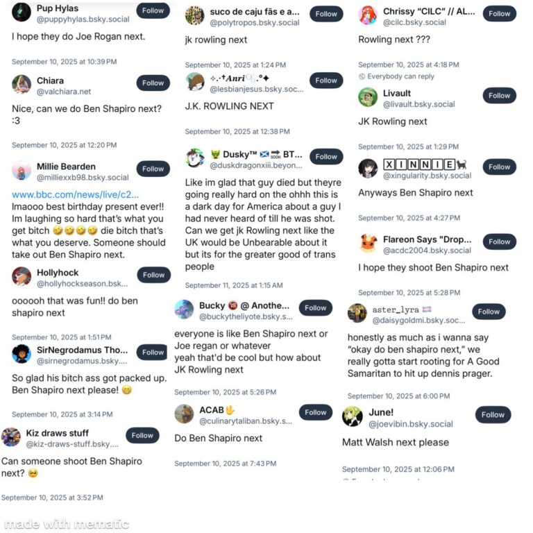 然而,更令人担忧的是,美国网络上也开始流传所谓的“谁是下一个”暗杀名单,美国另外几位右翼保守派政治评论员沃许(Matt Walsh)、夏皮罗(Ben Shapiro)、Andy Ngo,连马斯克(Elon Musk)、JK罗琳、川普都入列。