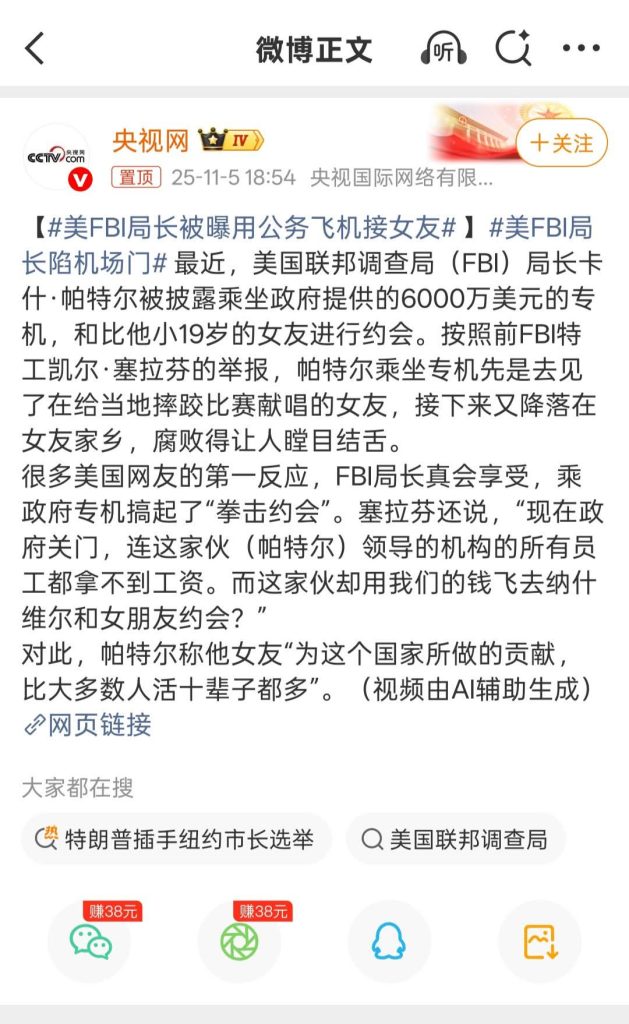 最近,美国又曝出惊天大瓜,美联邦调查局(FBI)局长卡什·帕特尔乘坐政府专机,接比他小19岁的女友约会。