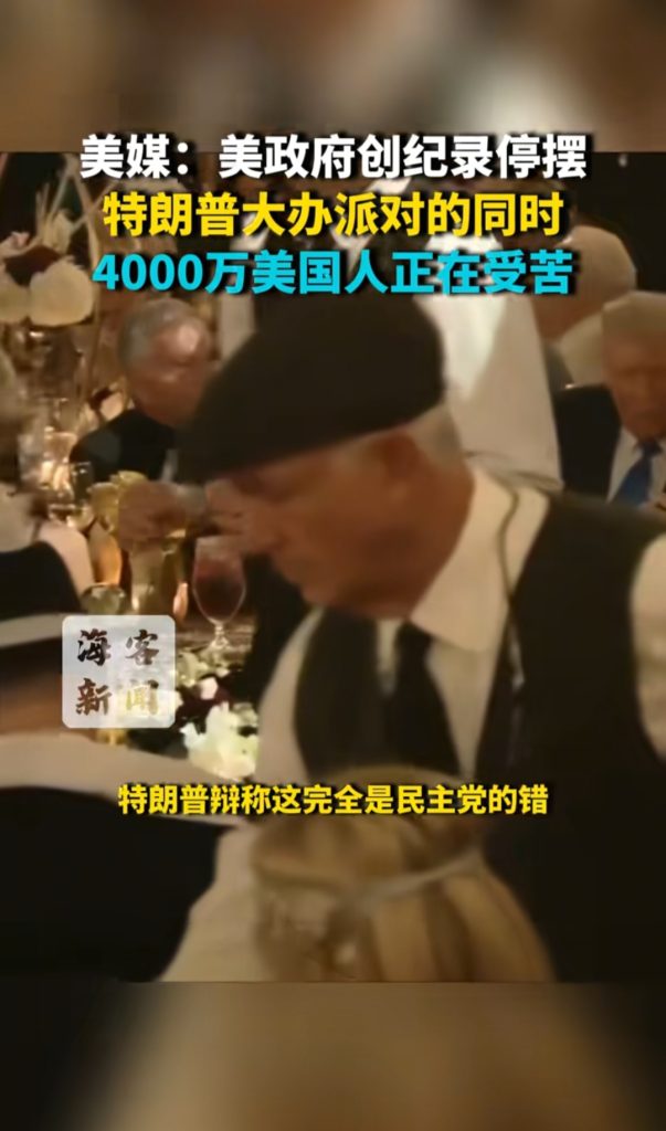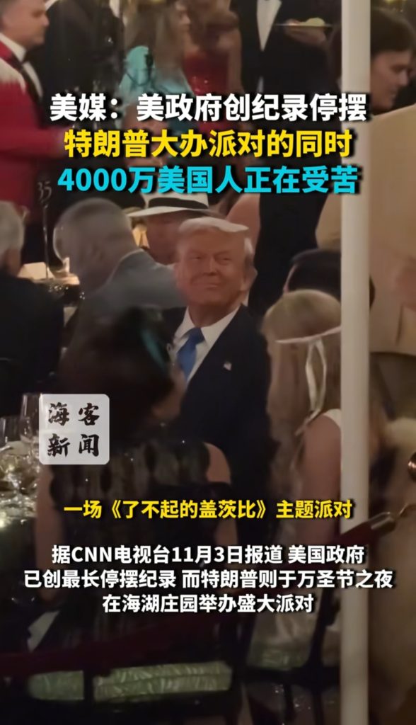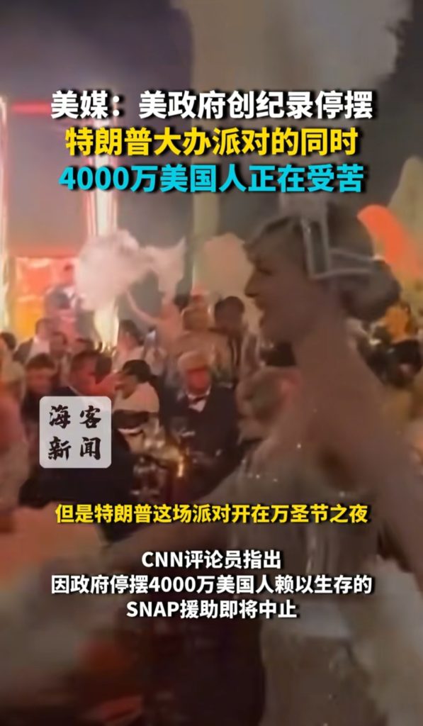 据悉,美政府关门已长达 37 天,刷新美政府最长停摆记录。大量美公务人员领不到工资,4200 万美国民众包括 1600 万美国儿童领不到食物救济。即便这样,也没耽误美国总统特朗普万圣节之夜在海湖庄园举办盛大宴会派对。