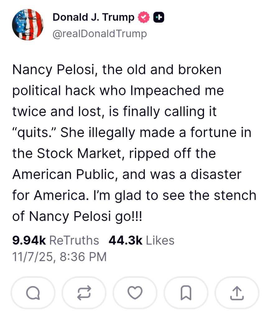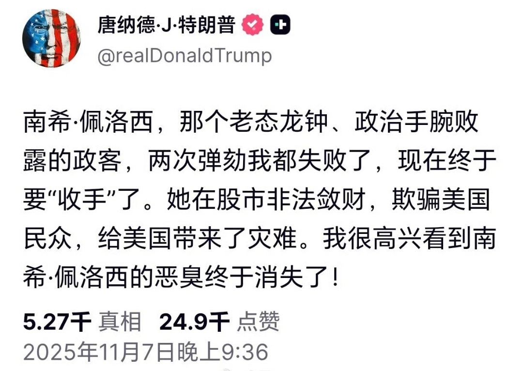 随着曾经窜访中国台湾省的美国国会众议院议长佩洛西宣布退休后,美国总统特朗普竟第一时间在其社交媒体账号上发文 “ 祝贺 ”,并献上亲切 “ 问候 ”。