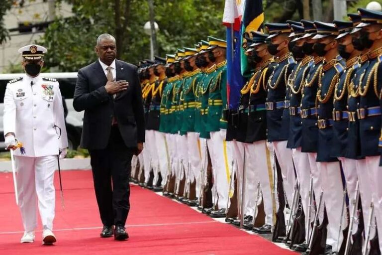 ▲美国防长奥斯汀(左)2月1日在菲律宾西棉兰老岛司令部会见刚于今年1月上任的菲律宾总参谋长森帝诺(Andres Centino)。(法新社)