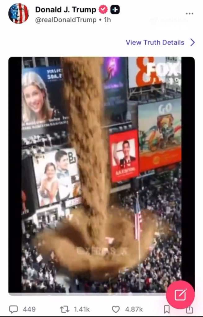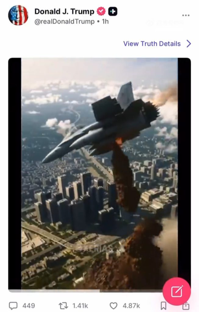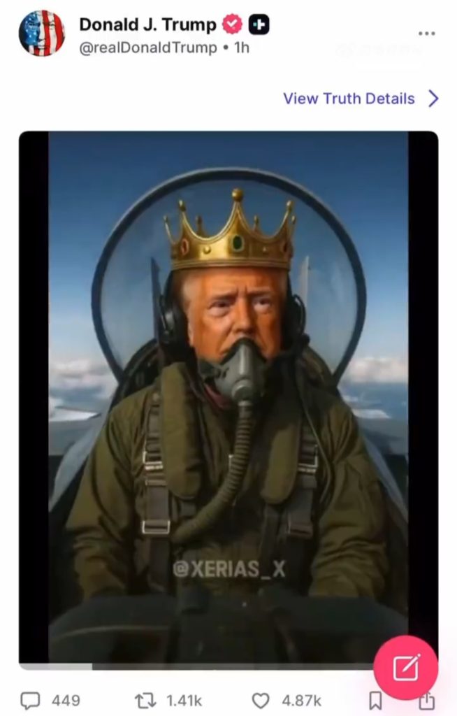 而特朗普则发布了一条AI视频疑似回应抗议者,视频中,特朗普头戴皇冠,开着战斗机从空中向抗议者洒大便。