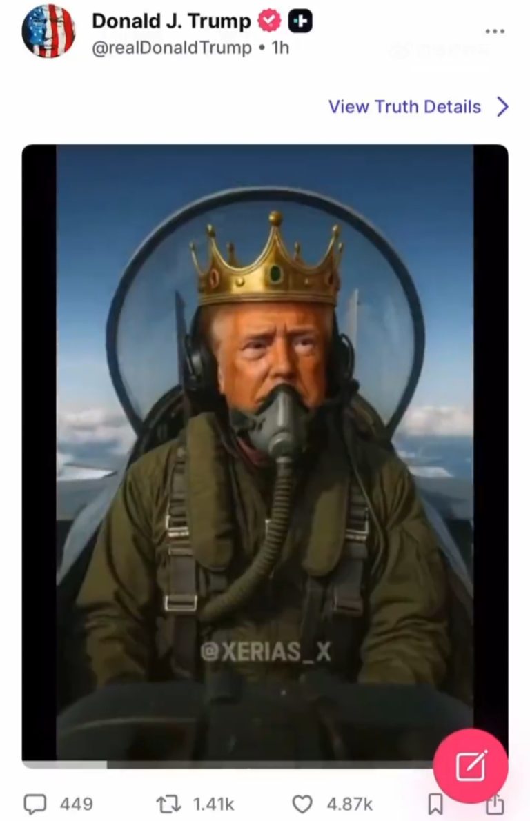 而特朗普则发布了一条AI视频疑似回应抗议者,视频中,特朗普头戴皇冠,开着战斗机从空中向抗议者洒大便。