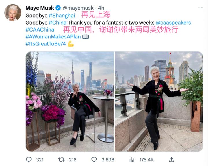 “再见中国,谢谢你让我度过了美妙的两周。”当地时间2日,特斯拉和推特CEO马斯克的母亲梅耶·马斯克在社交媒体上发文,称结束了为期两周的中国之旅。