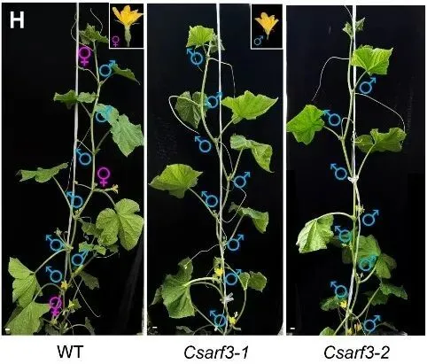 韩立杰在实验中发现,当CsARF3被编辑突变后,黄瓜植株竟然不再产生雌花,全部变为雄花;相反,当该基因过表达时,雌花数量显著增加。更重要的是,即使外施生长素也无法挽回突变体的表型。这证明,CsARF3是生长素信号通路中不可或缺的关键环节。
