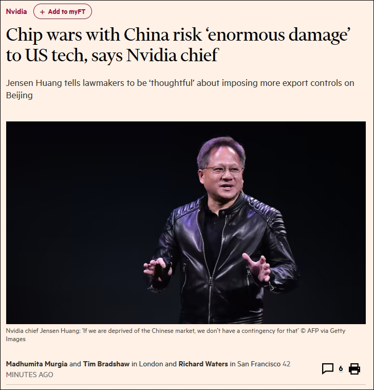 黄仁勋指出,中国约占据了美国科技产业三分之一的市场,其作为半导体零部件来源地和产品终端市场的地位,让其无法取代。他就此警告美国官员,在对中国实施进一步限制时必须“深思熟虑”。