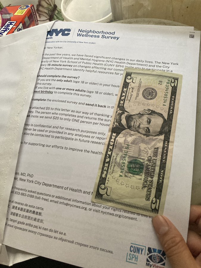 在信封里装有5元美钞、由60个问题组成的调查问卷、纽约卫生专员瓦桑(Ashwin Vasan)的说明文章等等,其中解释了问卷参与者能够对市府起到什么样的帮助。