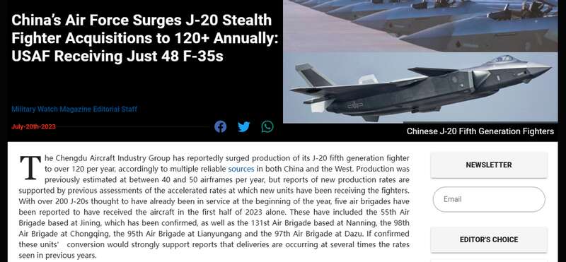 数日前,美国“Military Watch”网站撰文,就最近一段时间中美空军隐身战斗机性能、规模的发展做了简单评论,顺带还“嘲讽”了一下难产中的俄罗斯苏-57。作为当下全球仅有的三个隐身战机生产国,中美俄在隐身战机领域的发展,直接影响世界空中格局。有趣的是,这篇来自美国媒体的文章,以及社交媒体上一篇以所谓“中国成飞集团7月13日讯”开篇的未知出处短文,让“歼-20年产量120架”的说法广为传播,只可惜这个数据必然是假的。