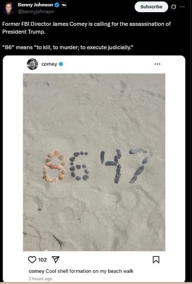 美国国土安全部长诺姆过后在X平台推文,指科米公开呼吁刺杀川普,国土安全部和特勤局正在展开调查,并会作出适当回应。