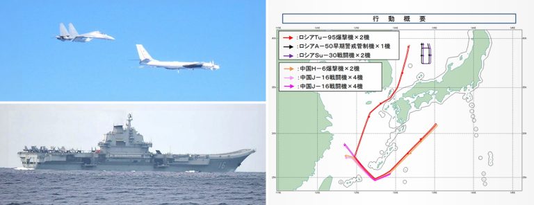 中国国防部9日发布消息称,根据中俄两军年度合作计划,当天双方在东海、太平洋西部空域组织实施第10次联合空中战略巡航。与此同时,中国海军辽宁舰航母编队在宫古海峡附近海域进行训练。