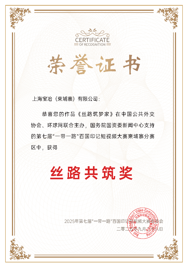 此次《丝路筑梦家》获奖,不仅是对宝冶柬埔寨属地化传播成果的肯定,更为中柬企业讲好 “一带一路” 合作故事提供了鲜活范本。未来,宝冶柬埔寨将继续以员工真实故事为切入点,用更贴近当地民众的传播方式,传递中柬共建共享的发展理念,让“一带一路”的友谊之花在柬埔寨绽放得更加绚烂。