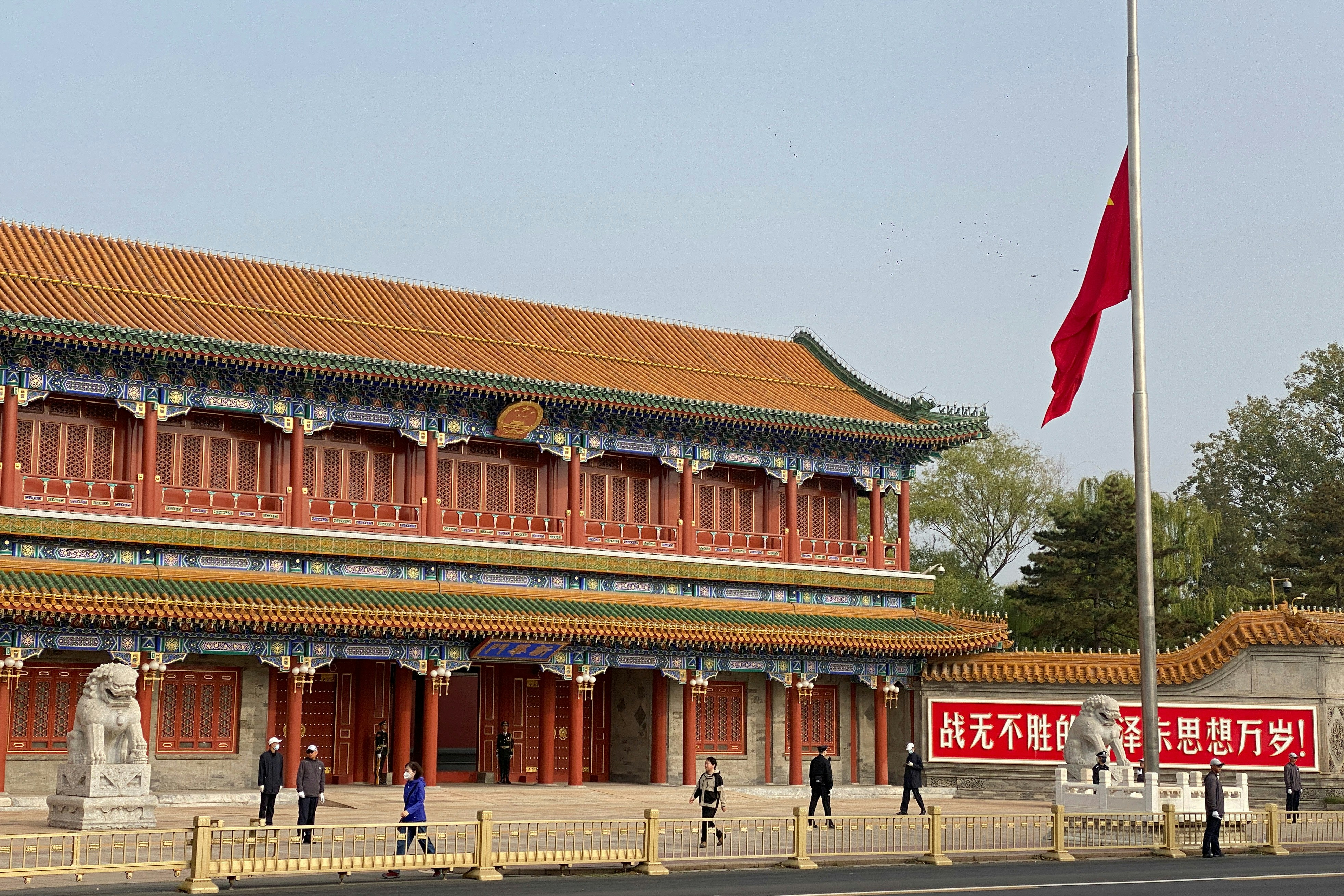 中国国旗:The Chinese flag at a gate to the Zhongnanhai leadership compound flies at half-mast in memory of late former Chinese premier Li Keqiang, in Beijing, China November 2, 2023. REUTERS/Mark Chisholm