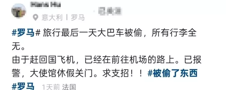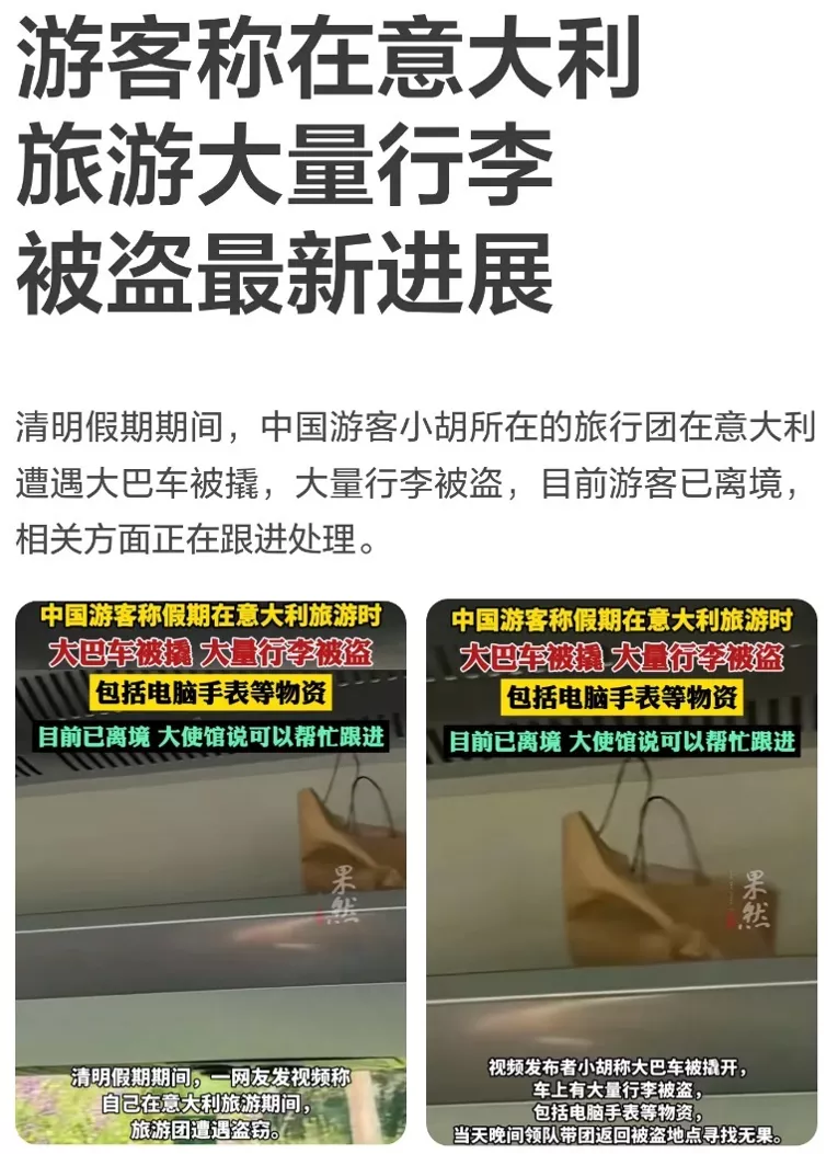 近日,一则发生在意大利的盗窃事件在社交媒体上引发热议。一支华人旅行团在当地旅游时,大巴车被人撬开,车上行李几乎被“清空”,电脑、手表等贵重物品全部被盗。