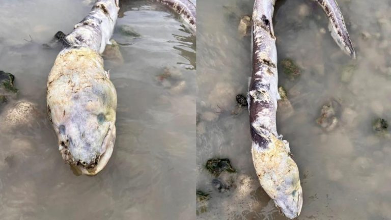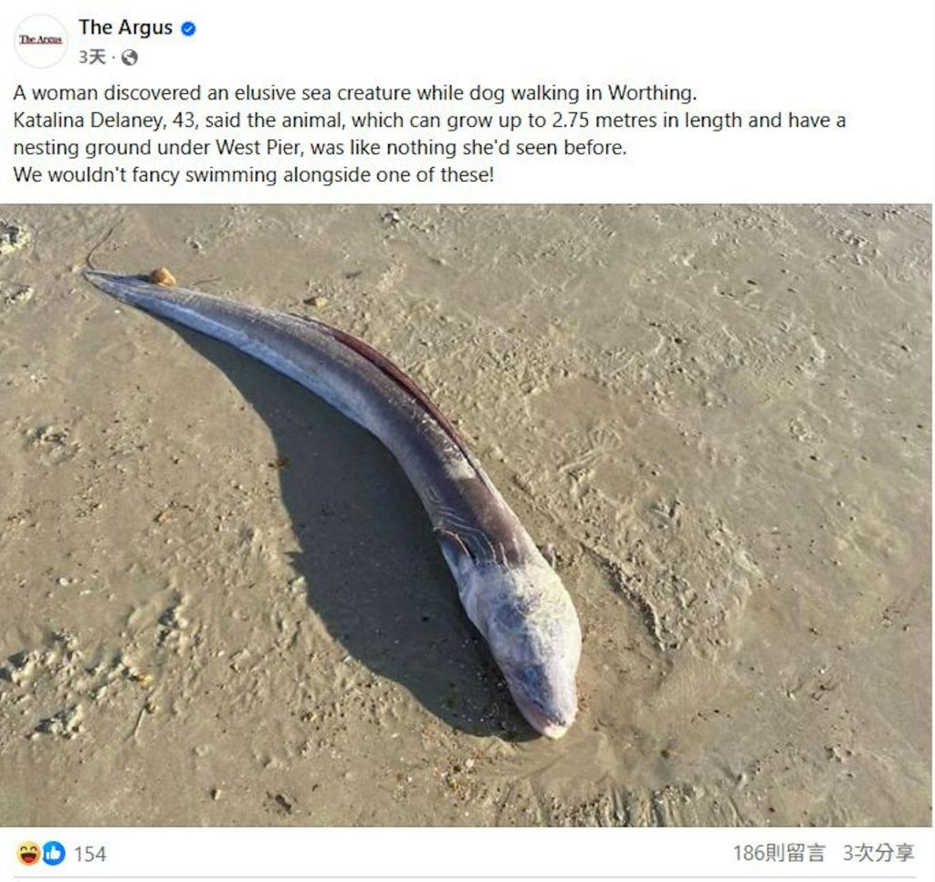 英国西索塞克斯郡一座海滨城市沃辛(Worthing)近日出现一隻「怪鱼」,让当地民众全吓坏。43岁女子德莱妮2日在海滩遛狗时发现一条已经死亡的巨大长鱼被冲上岸,宛如电影裡的场景,相当诡异。