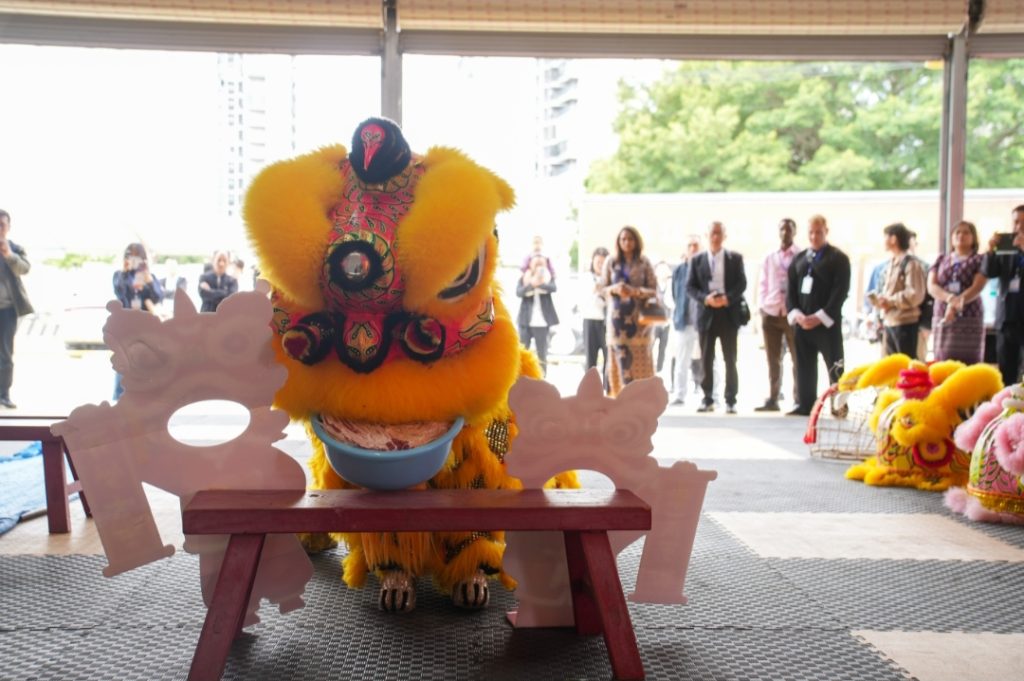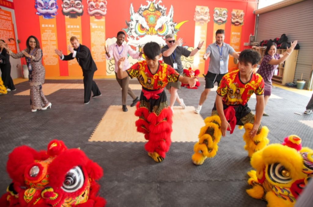 10月21日,20余家境外媒体记者与网络媒体达人走进狮韵醒狮传承基地,近距离感受醒狮文化的独特魅力。