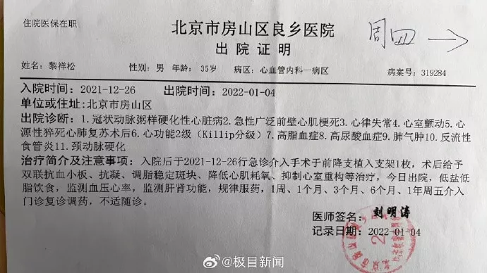 在心梗突发前一两个月,身体早已发出过预警。2021年11月初的一个深夜,二梨在睡梦中被突如其来的胸痛惊醒,痛感持续了约5秒,“那种疼从未有过,左胸和左胳膊都痛,醒来后左胳膊的那种痛好像有人在抽里面的筋。”次日他请假前往一家三甲医院检查,医生没有查出异常,他便照常回归工作。