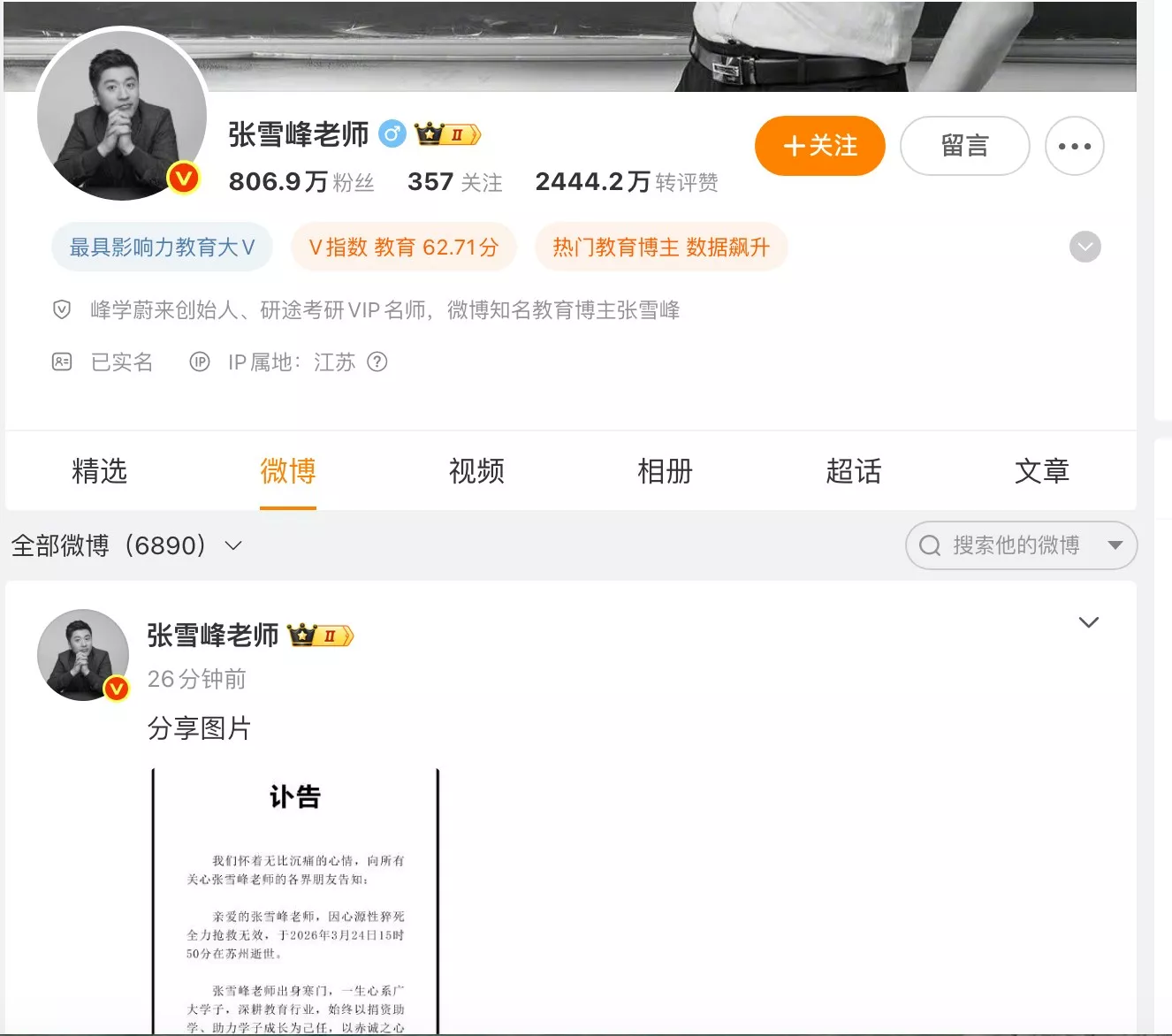 知名教育博主张雪峰跑步时突感不适,送院后抢求无效,享年41岁。(网上图片)