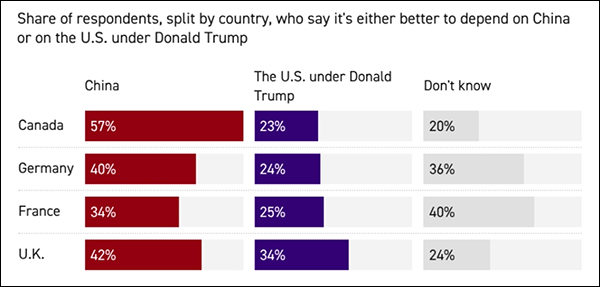 调查显示,这种态度转变主要是由特朗普推动的。加拿大和德国的大多数受访者明确表示,与中国走得更近,是因为美国变得不再可靠,法国和英国也分别有38%、42%的受访者持同样的看法。