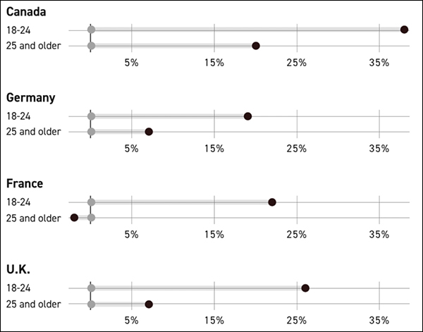 根据最新民调,在这四个国家中,公众普遍支持与美国保持一定距离,并承认本国在经济上对中国的依赖程度更高。例如,在加拿大,48%的受访者认为减少对美国的依赖是可行的,而且政府应该这样做;在英国,42%的受访者表示理论上支持减少对美国的依赖,虽然对其现实可行性持怀疑态度。