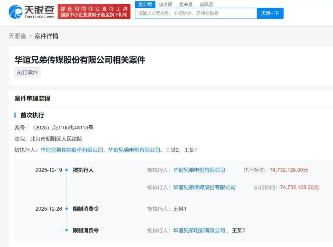 据中国执行信息公开网,近日,华谊兄弟传媒股份有限公司、华谊兄弟电影有限公司新增一则被执行人信息,执行标的¥7473万余元。