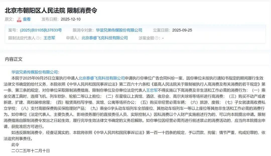 天眼查APP显示,近日,华谊兄弟电影有限公司、华谊兄弟传媒股份有限公司(300027.SZ)及两公司法定代表人王忠磊、王忠军被限制高消费,涉及¥7473万元执行案件,执行法院为北京市朝阳区人民法院。