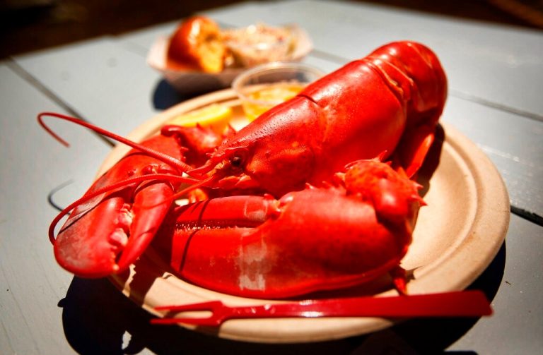 FILE-A cooked lobster is served on a picnic table at McLoon's Lobster Shack in Spruce Head, Maine, in this July 19, 2018 file photo. Lobster prices are dipping somewhat in front of Memorial Day, which marks the unofficial start of the industry's busy season. (AP Photo/Robert F. Bukaty, File)