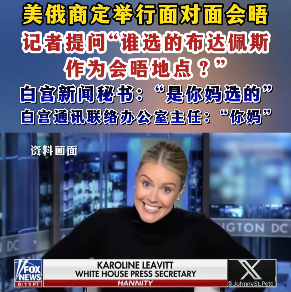 特朗普16日曾在社交媒体上发文称他将与俄罗斯总统普京在布达佩斯会晤。《赫芬邮报》记者对此提问:“为什么选定布达佩斯为会晤地?” 白宫发言人莱维特回复:“你妈定的。”此后《赫芬邮报》又询问莱维特是否认为自己的回答非常有趣,收到莱维特“更毒”的回复:“你居然真把自己当个记者了,真有意思。别再给我发你那些虚伪的、有偏见的狗屁问题了。”