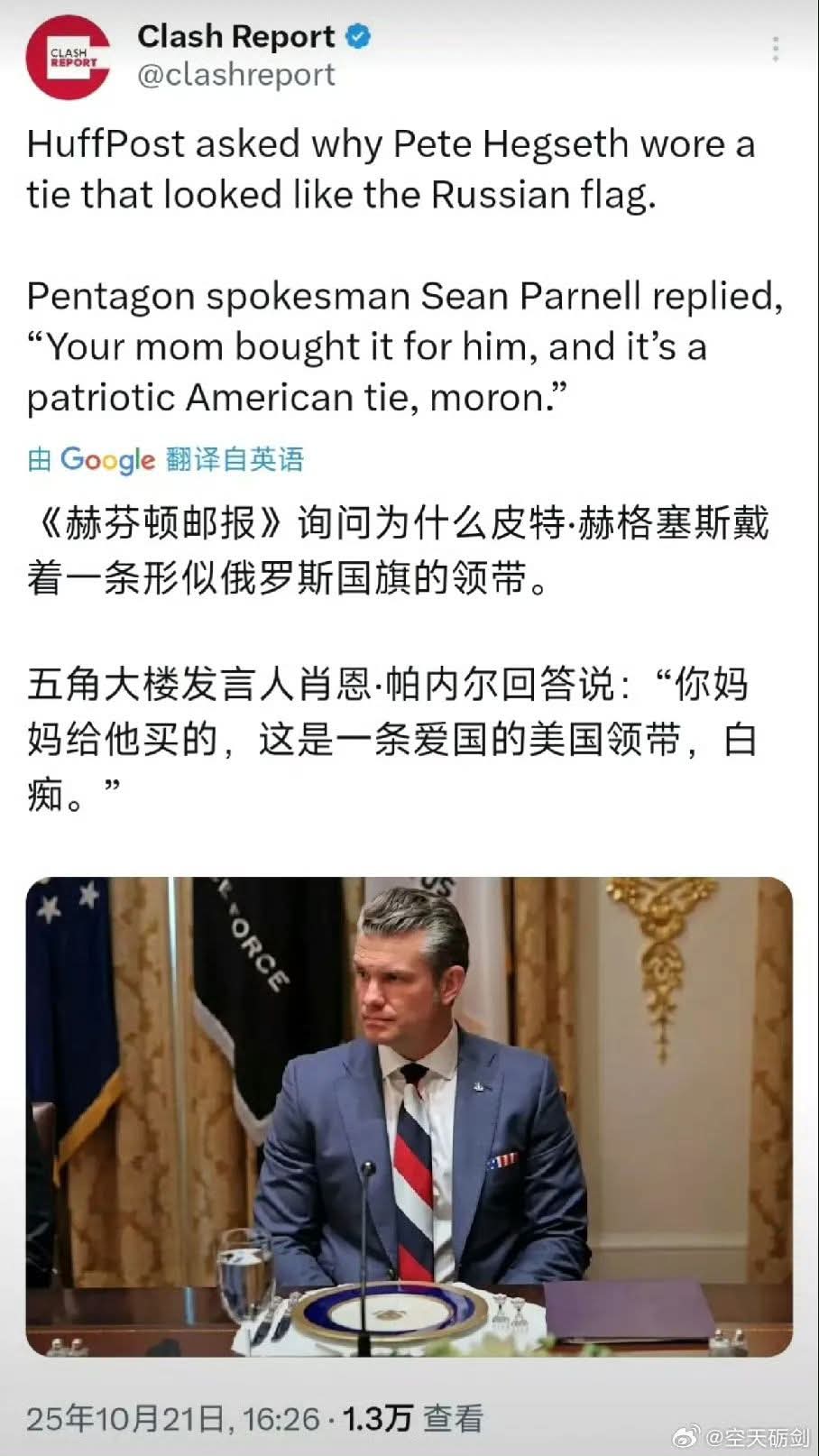 《赫芬邮报》报道称,在该媒体记者提问称赫格塞思是否知道俄方对上述领带的关注以及他此前是否曾佩戴过该领带时,帕内尔回答称:“你妈给他买的——这是一条爱国的美国领带。”