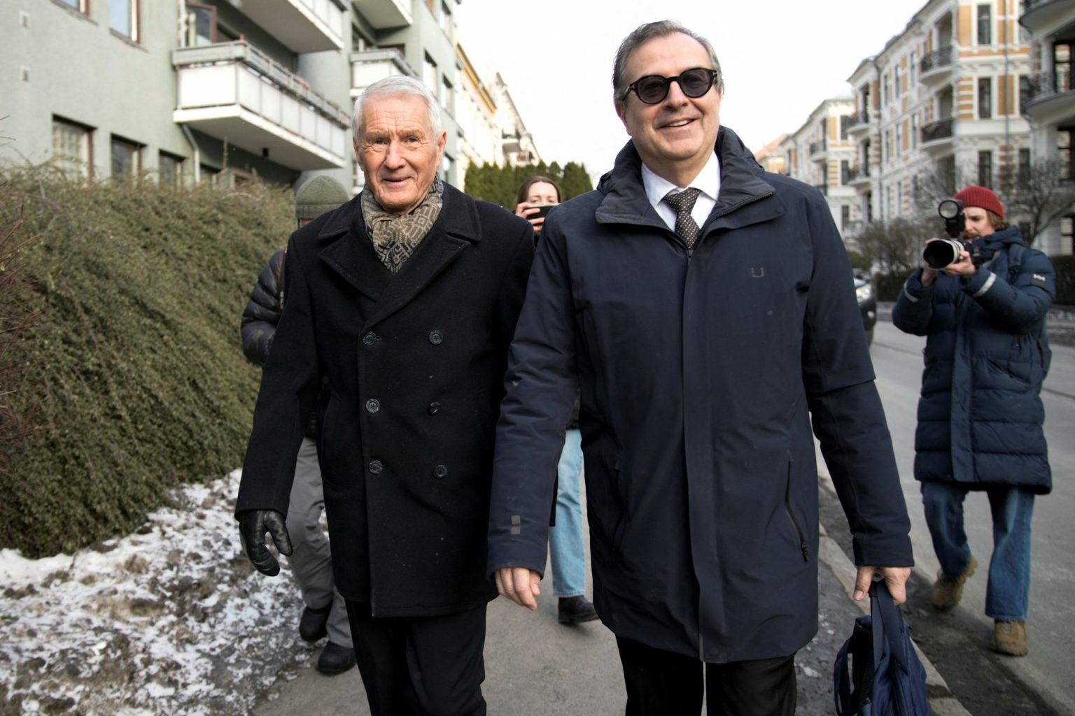 调查人员2026年2月12日搜查挪威前首相亚格兰(Thorbjorn Jagland)的居所,亚格兰(左)与代表律师在现场离开(NTB/Stian Lysberg Solum via REUTERS)