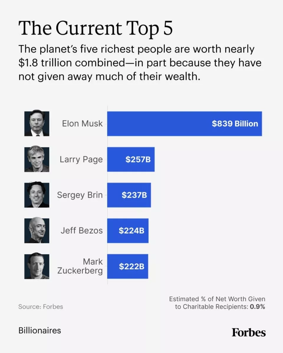 《福布斯》给出的一组数据显示,马斯克直接捐助困难群体的资金约为5亿美元。单看这一数字,或许算得上一笔巨款,但放到其8390亿美元的身家背景下,仅占0.06%。换言之,其账面每1000美元资产中,目前仅有约60美分,以公开、直接的形式用于帮扶个人或公益事业。
